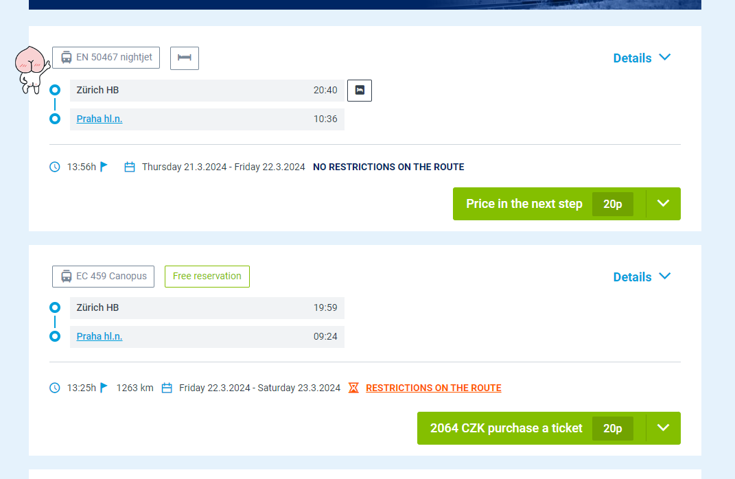 스위스(취리히)에서 체코(프라하) 야간열차 예약 가능한 날짜