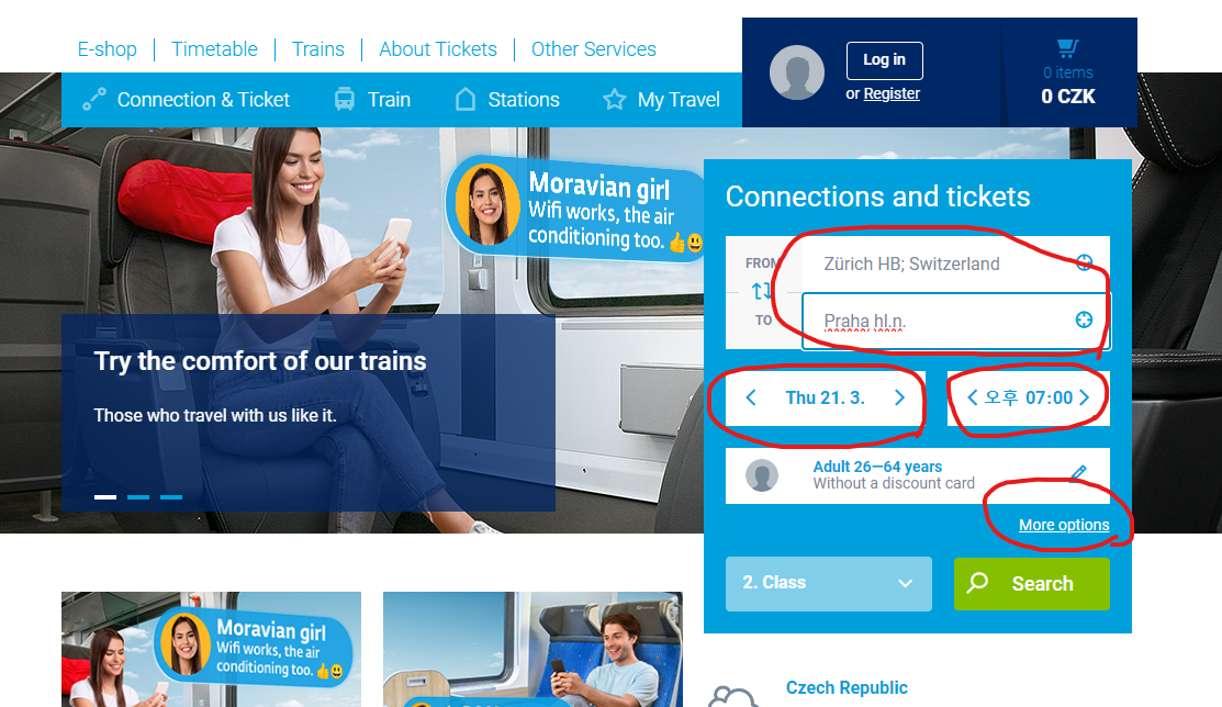 사진과 같이 From : Zurich HB To : Phaha hl.n. 이동할 날짜와 시간을 선택해 줍니다.