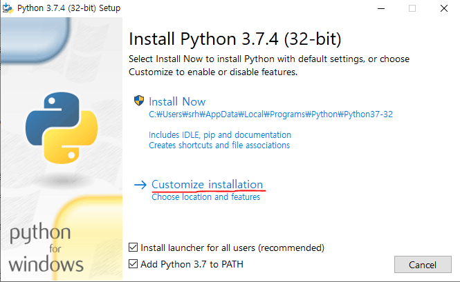 Add Python 3.7 to PATH 선택 후 Install Now 누르시면 기본 경로로 설치가 됩니다.